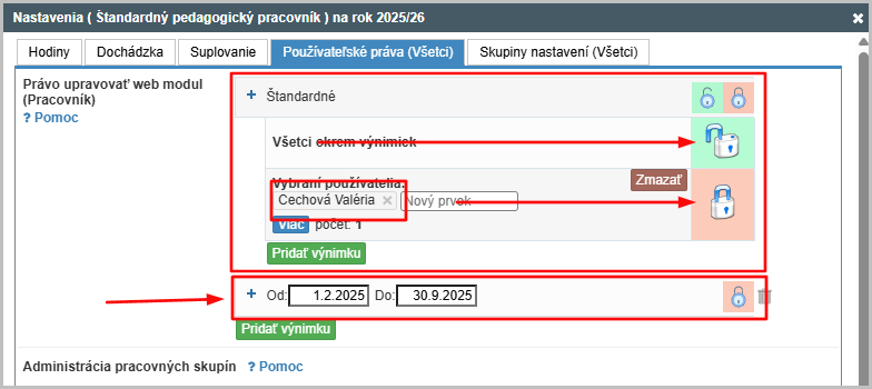 - alebo si k danému nastaveniu pridáme výnimku na zamestnancov, ktorí môžu/nemôžu upravovať dochádzku