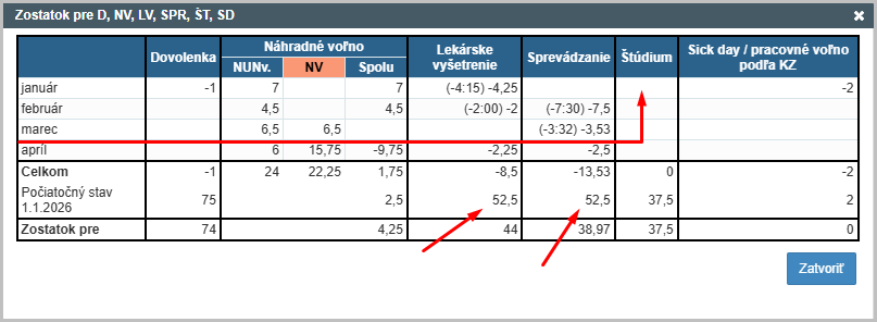 Zostatková tabuľka pracuje s informáciami z červených stĺpcov LV/SPR= hodiny prac.času.