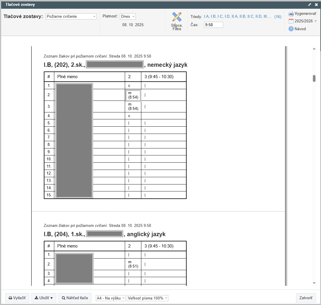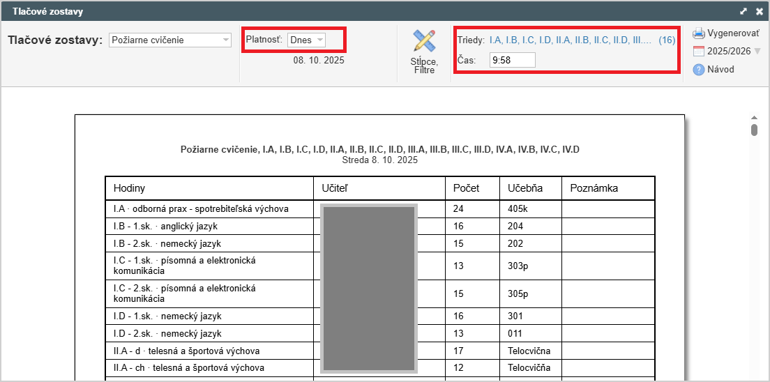 Tlačová zostava má prednastavený aktuálny dátum a čas, vygeneruje sa pre všetky triedy.