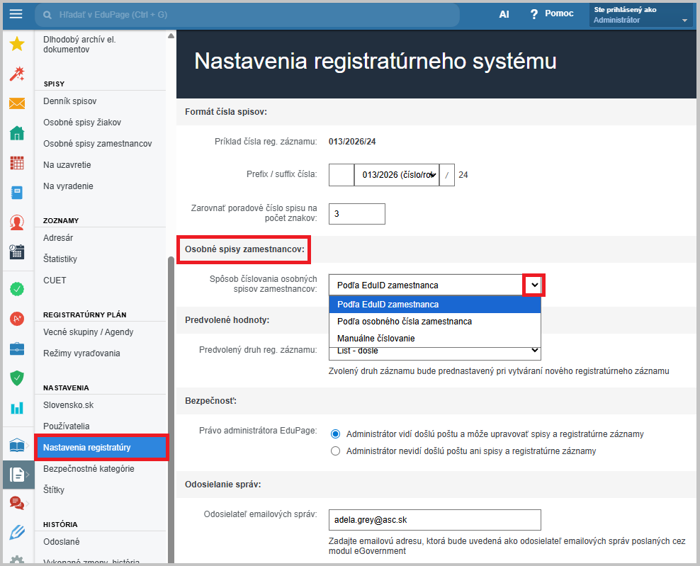 Prednastavené je číslovanie "Podľa EduID zamestnanca".