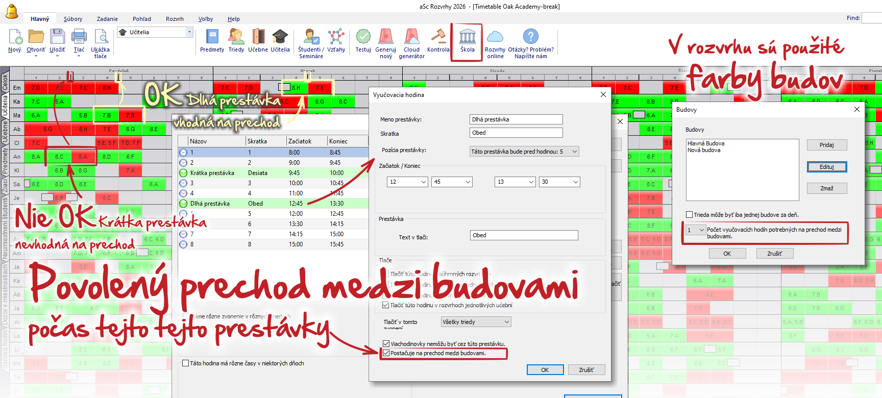 Každej vytvorenej prestávke môžete nastaviť, či je/nie je vhodná na presun medzi budovami. Program potom túto prestávku započíta medzi možné presuny rovnako ako voľnú hodinu.
