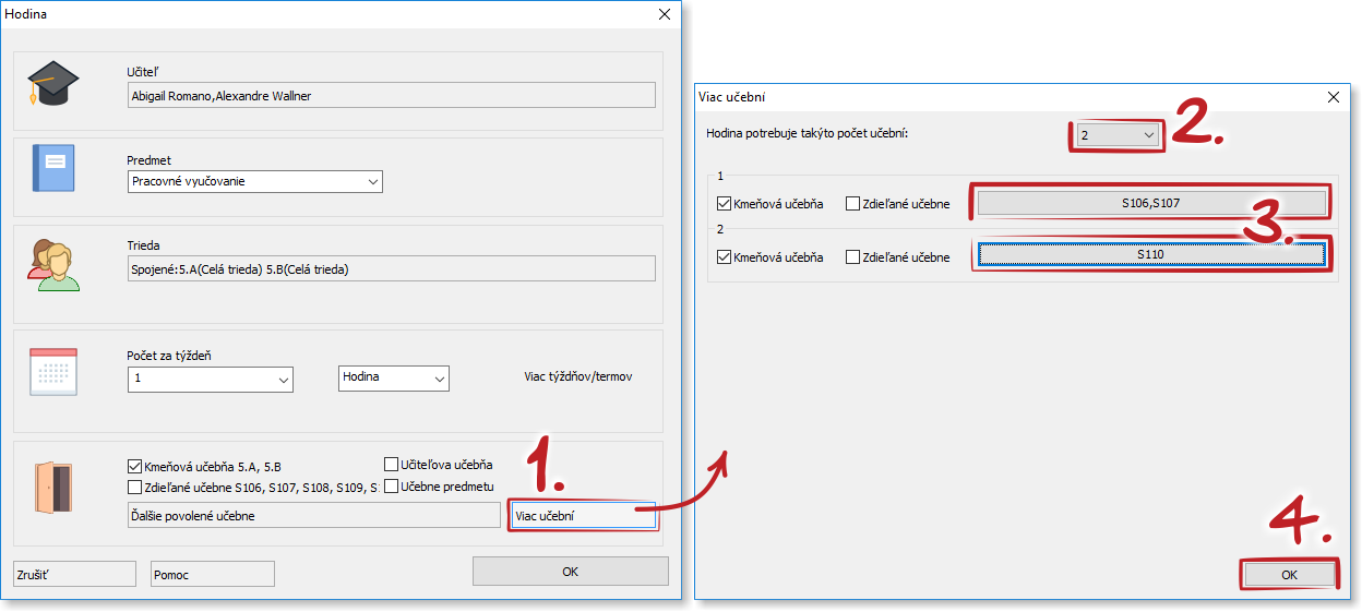 1.príklad: Na Pracovnom vyučovaní sú do jednej hodiny spojené dve triedy s dvoma vyučujúcimi. Potrebujeme ich umiestniť do dvoch učební.