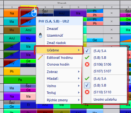 Pri ručnom editovaní rozvrhu toto môžete vidieť v okienku Učebne: