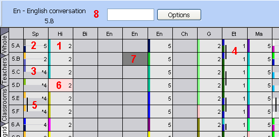 1) Ak bunka v osnove je svetlo šedá, znamená to, že predmet v danom stĺpci sa učí v príslušnej triede. Číslo v bunke zobrazuje počet hodín za týždeň. Farebný prúžok na ľavej strane bunky zobrazuje farbu učiteľa.