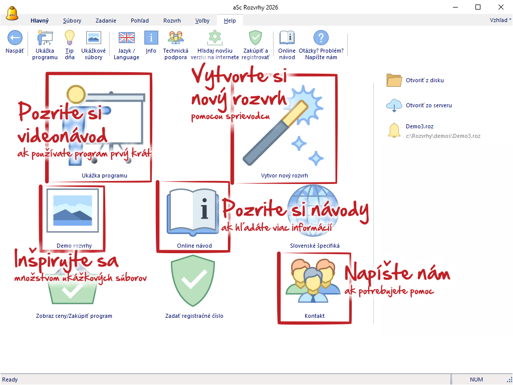 Doporučujeme vám, aby ste si najskôr pozreli Ukážku programu, ktorá vám ukáže základy práce v programe. Získate tak informáciu o tom, čo všetko program dokáže a aké funkcie v programe nájdete.