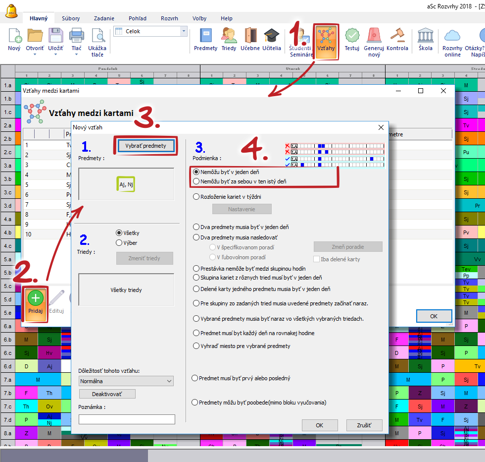 Môžete vytvoriť vzťah medzi kartičkami, ktorý definuje, že dva predmety nemôžu byť za sebou alebo nemôžu byť v ten istý deň: