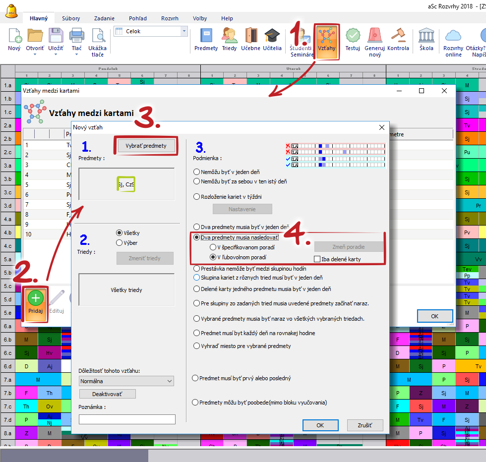 Môžete vytvoriť nový vzťah medzi kartami, ktorý zadefinuje, že dva predmety musia nasledovať po sebe v špecifikovanom alebo ľubovolnom poradí: