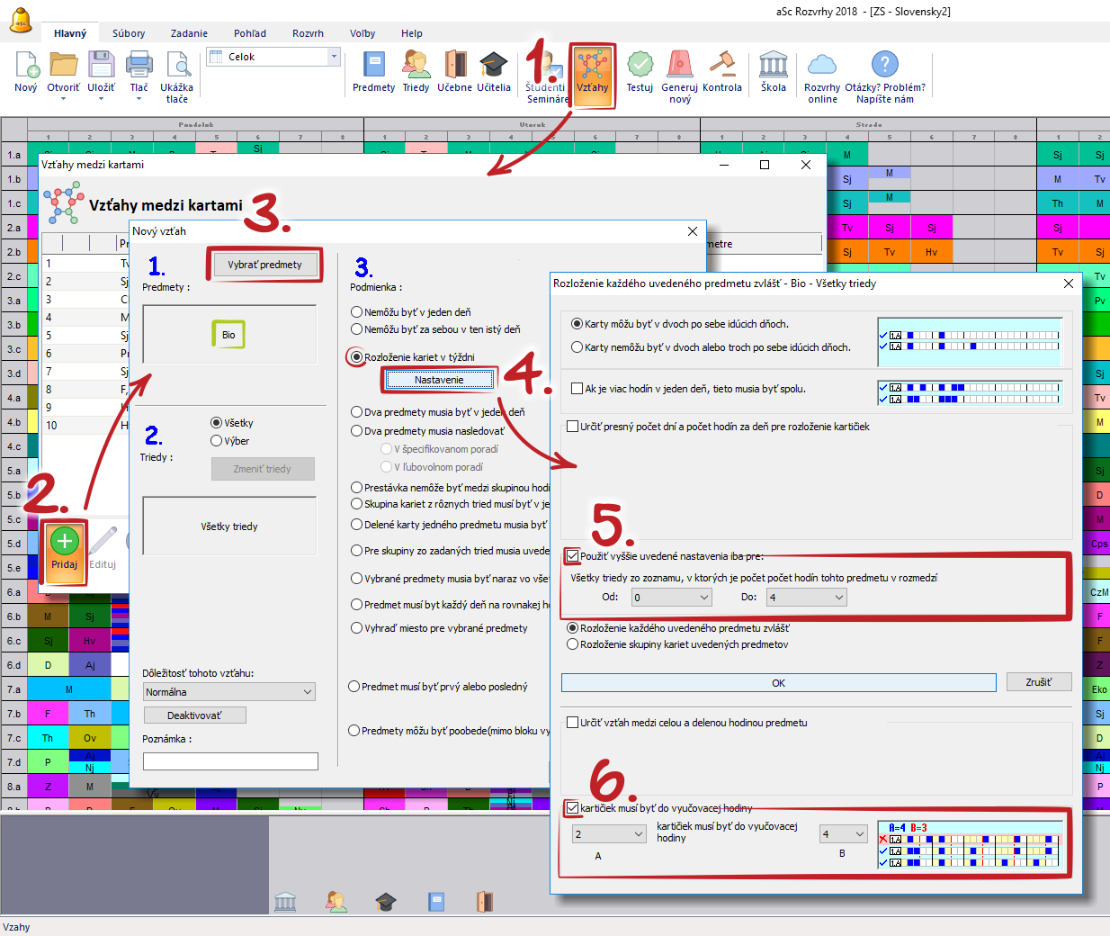Napríklad tento obrázok definuje vzťah medzi kartami pre všetky triedy, ktoré majú 1,2,3 alebo 4 hodiny biológie. Pre tieto triedy generátor vždy umiestni aspoň 2 hodiny biológie pred 4 vyučovacou hodinou: