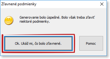 V prípade, že ste pred generovaním dovolili poľavenie z podmienok, je možné, že na konci generovania uvidíte takéto dialógové okno: