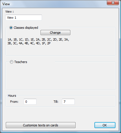Zadajte, ktoré dni sa zobrazia a ako aj počet hodín za týždeň. Zadajte počet hodín vrátane nultých hodín. Potom označte tie triedy alebo učiteľov, ktorých chcete vidieť v tomto pohľade.