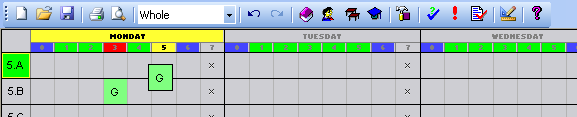 Keď umiestnite kartičku, program automaticky danej hodine priradí zo zoznamu voľných učební niektorú voľnú učebňu. Ak umiesnite kartičku na takú pozíciu, kde nie je žiadna učebňa voľná, program to síce akceptuje, ale na ľavom okraji kartičky sa zobrazí biely prúžok na označenie toho, že tejto kartičke nie je priradená žiadna učebňa.