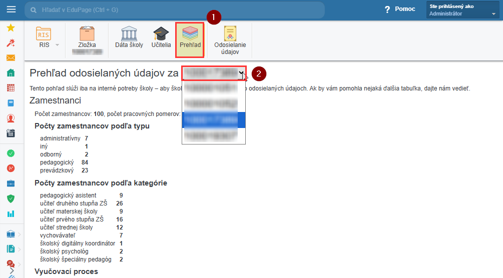 1. V hornom menu zvoľte Prehľad (1). Ak ste spojená škola alebo škola s viacerými organizačnými zložkami, tak si viete vybrať, za ktorú zložku sa má zobraziť prehľad dát (2).
