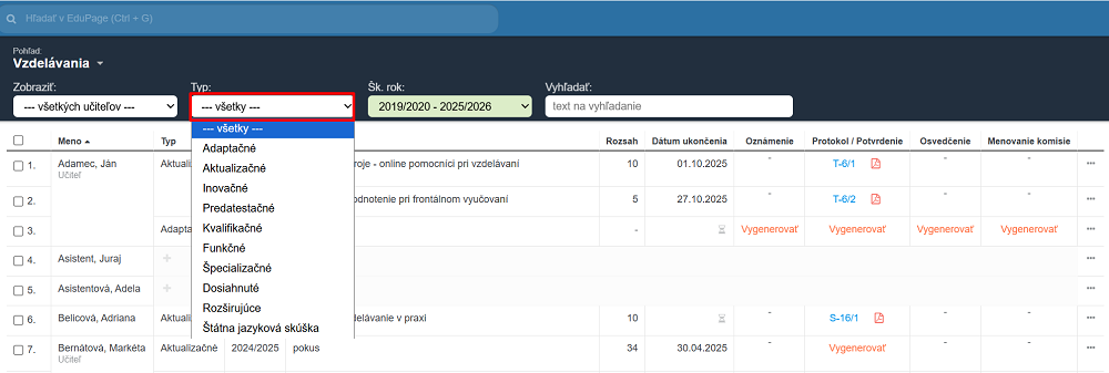 Potvrdenie o vzdelávaní môžete pripraviť aj viacerým učiteľom naraz. Zaškrtnite učiteľov, ktorí absolvovali rovnaké vzdelávanie.