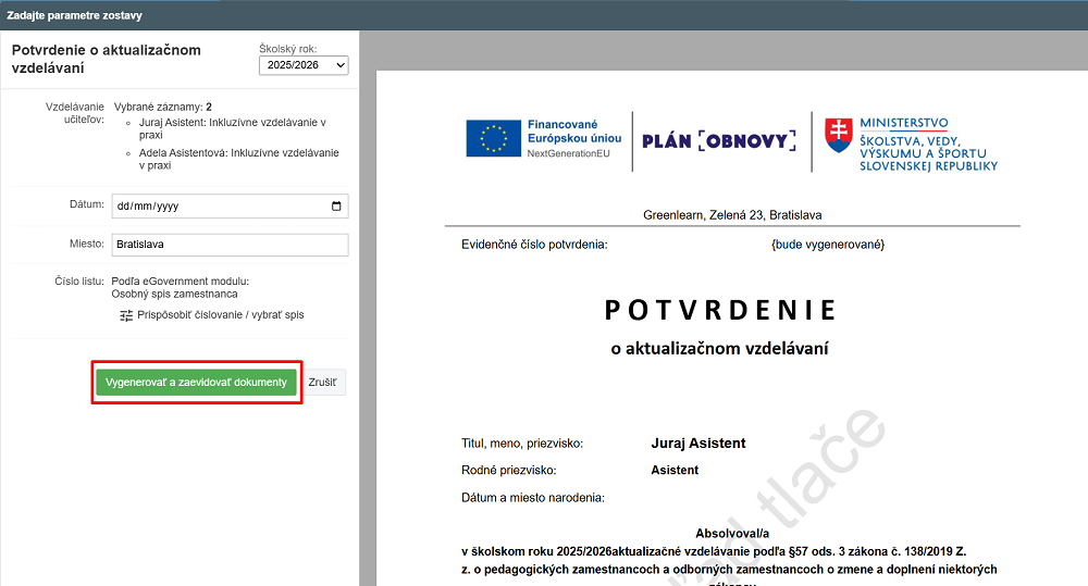 Zvoľte Vygenerovať a zaevidovať dokumenty. EduPage automaticky pridelí každému potvrdeniu číslo záznamu, ktoré nasleduje v osobnom spise každého učiteľa a zaradí ho do jeho osobného spisu.