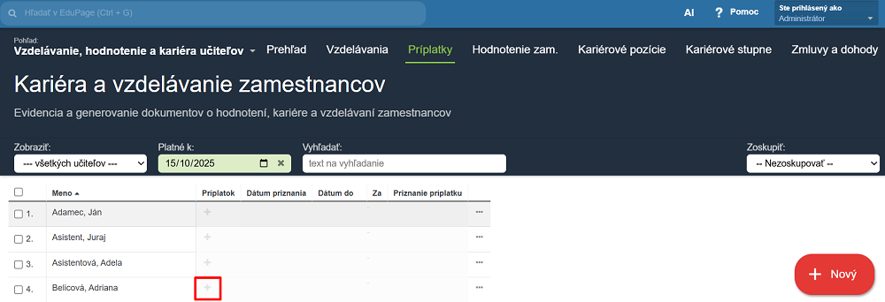 Zamestnancovi zadajte výšku príplatku za profesijný rozvoj cez znamienko plus pri jeho mene alebo kliknite na "Nový"
