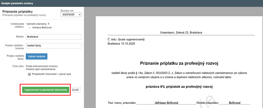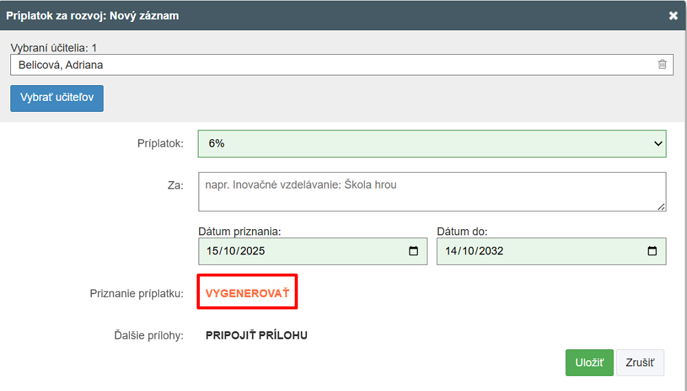 Vygenerujte Priznanie príplatku za profesijný rozvoj