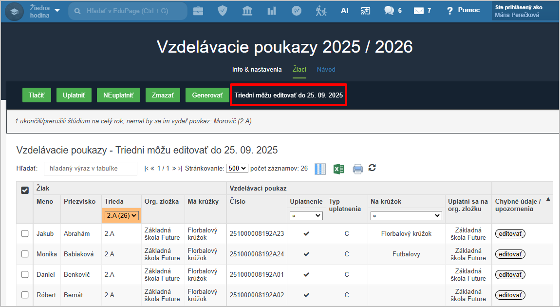 Administrátor EduPage však môže triednym učiteľom povoliť administráciu VP u žiakov vo svojej triede.