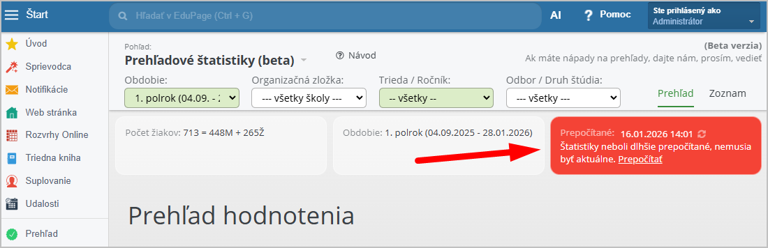Pokiaľ údaje v štatistikách neboli dlhšiu dobu prepočítané, systém zobrazí červené upozornenie o tom, že je potrebné štatistiky prepočítať.