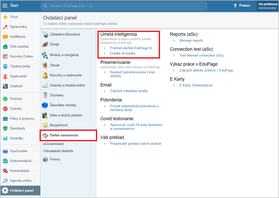 Administrátor si môže kedykoľvek pozrieť prehľad čerpania kreditu v súvislosti s používaním EduPage AI.
