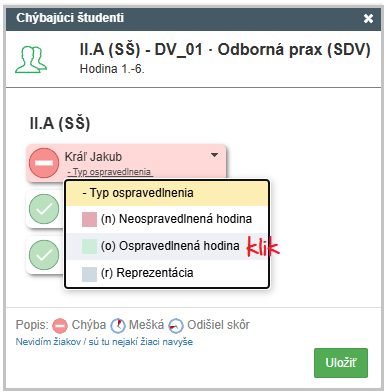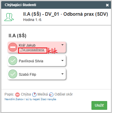 V okienku žiaka sa potom pridá voľba "Typ ospravedlnenia". Kliknite na ňu.