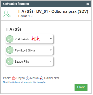 V zozname vyhľadajte chýbajúceho žiaka. Raz na neho kliknite. Označíte ho, že "chýba".