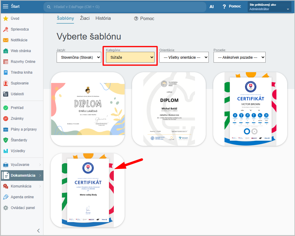 Vyfiltrujte diplomy v kategórii Súťaže a vyberte označený diplom.