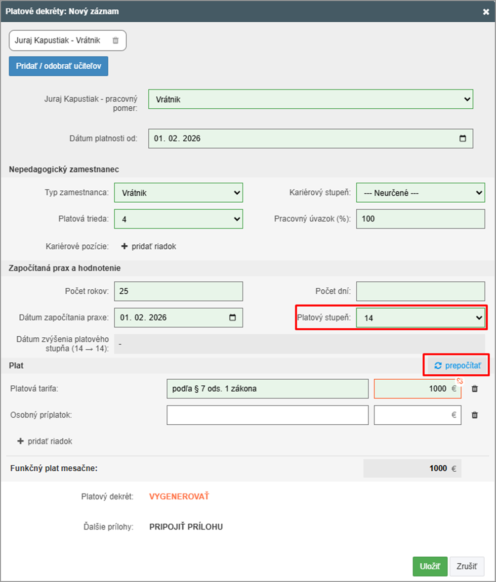 2. Ak je zamestnanec zaradený podľa interného predpisu školy do najvyššieho platového stupňa, bez ohľadu na počet odpracovaných rokov, platový stupeň mu zmeníte manuálne a kliknete na "prepočítať." dekrét.