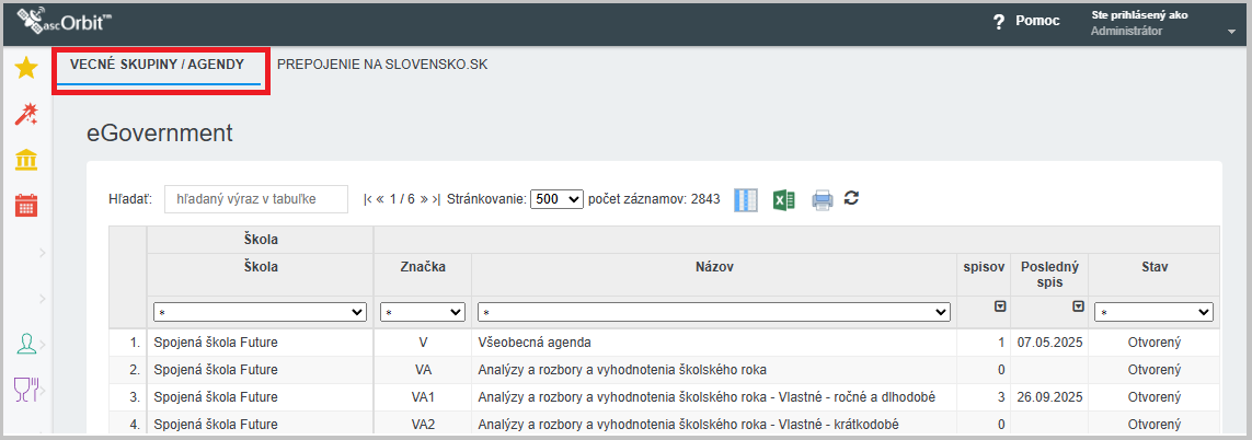 V záložke "Vecné skupiny/Agendy" vidíte pre každú školu počet spisov v rôznych vecných skupinách.
