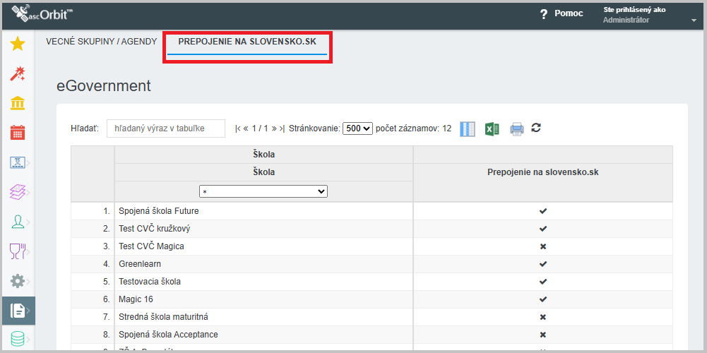 Vyberte záložku "Prepojenie na slovensko.sk". Školy, ktoré majú prepojenú svoju eschránku s modulom eGovernment v EduPage, aktívne tento modul používajú.