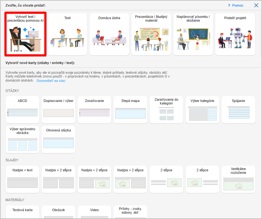 Zvoľte prvú možnosť - Vytvoriť test/prezentáciui pomocou AI.