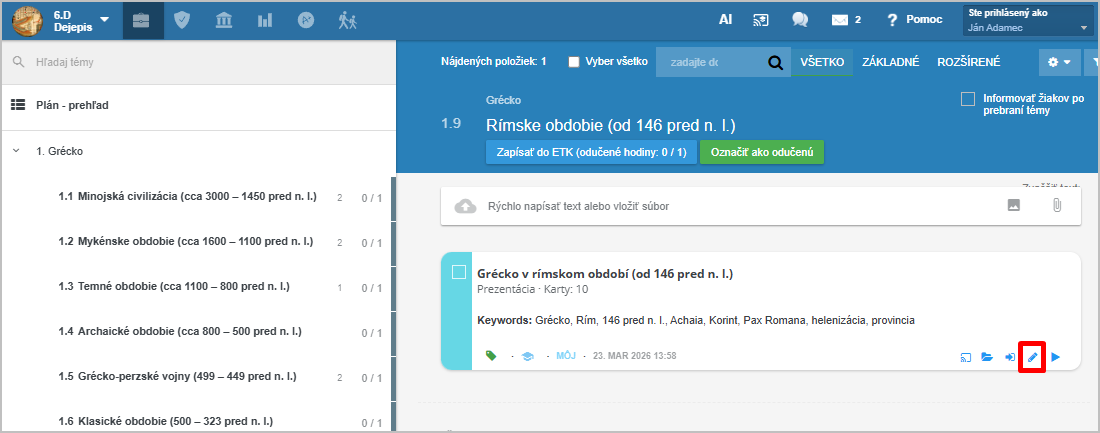 Typ materiálu zvoľte - test. EduPage predvyplní názov témy, na ktorej ste nastavený v pláne. V prípade potreby môžete upresniť zadanie.