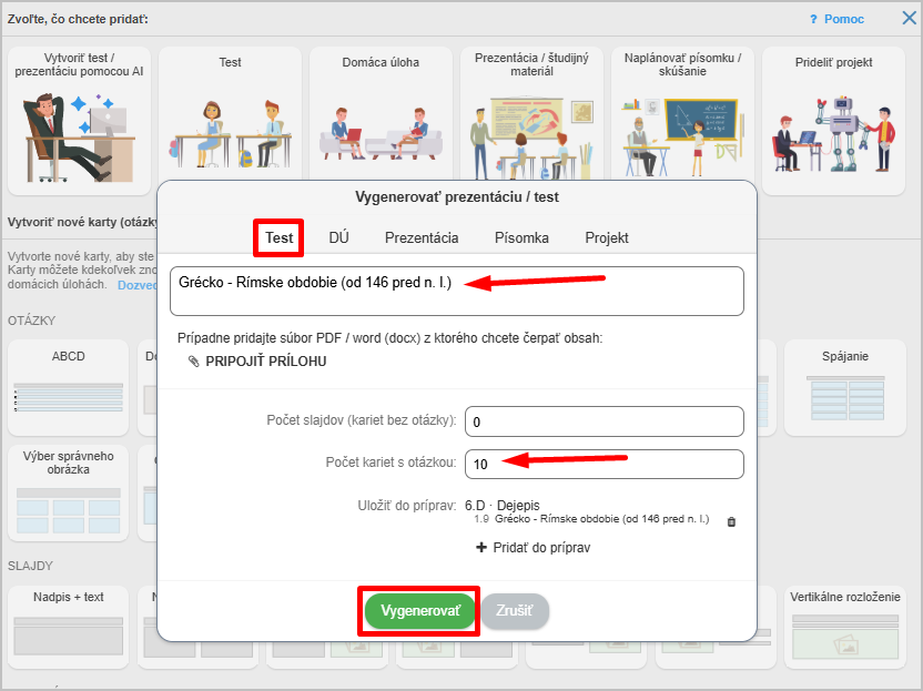 Zvoľte počet otázok v teste, počet slajdov nastavte na 0. Stlačte Vygnerovať.