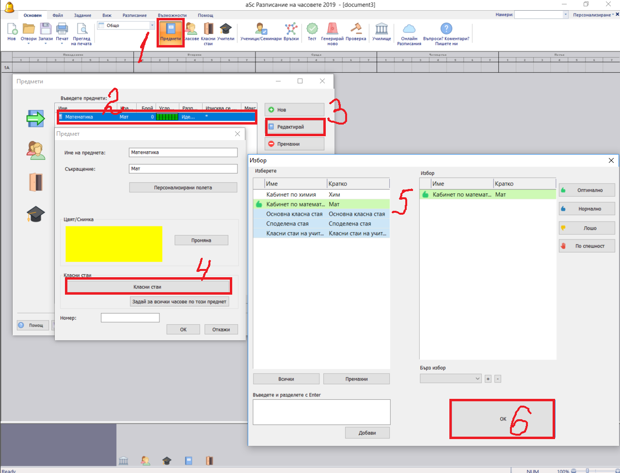 Тук можете да определите класните стаи, в които ще се преподава определен учебен предмет.