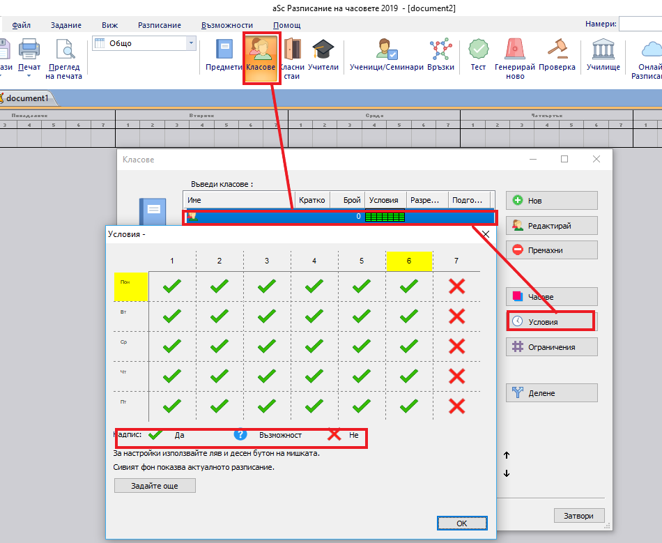 Като кликнете върху Условия, можете да определите кога дадена паралелка може или не може да има часове. Можете да дезактивирате часовете в седмичното разписание за времето, за което паралелката не може да има часове.