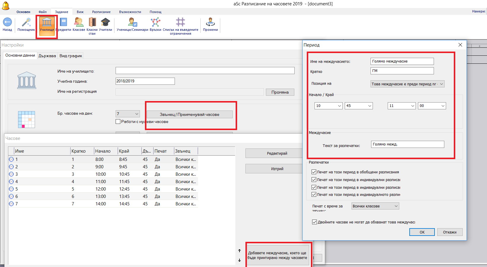 Ако имате по-дълги междучасия, които трябва да бъдат обозначени в разпечатките на седмичното разписание, можете да ги добавите като използвате бутон "Добавете междучасие, което ще бъде принтирано между часовете":
