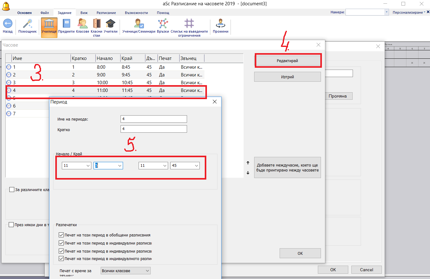 3. При така направената селекция на - "Звънци 2", просто променете времето за съответните различни часове. Изберете съответния час, кликнете на "Редактирай" и ги променете. Виждате отдолу настройките за "Звънци 1", така че трябва да настроите само там, където времето е различно.