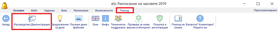 Видео презентацията може да се пусне от диалоговия прозорец за демонстрации или от меню „Помощ“ – „Ръководство/Демонстрация“: