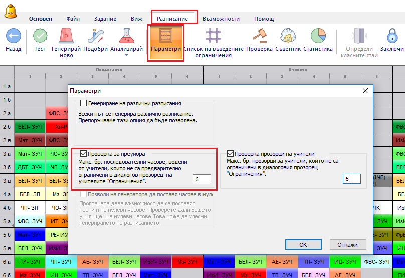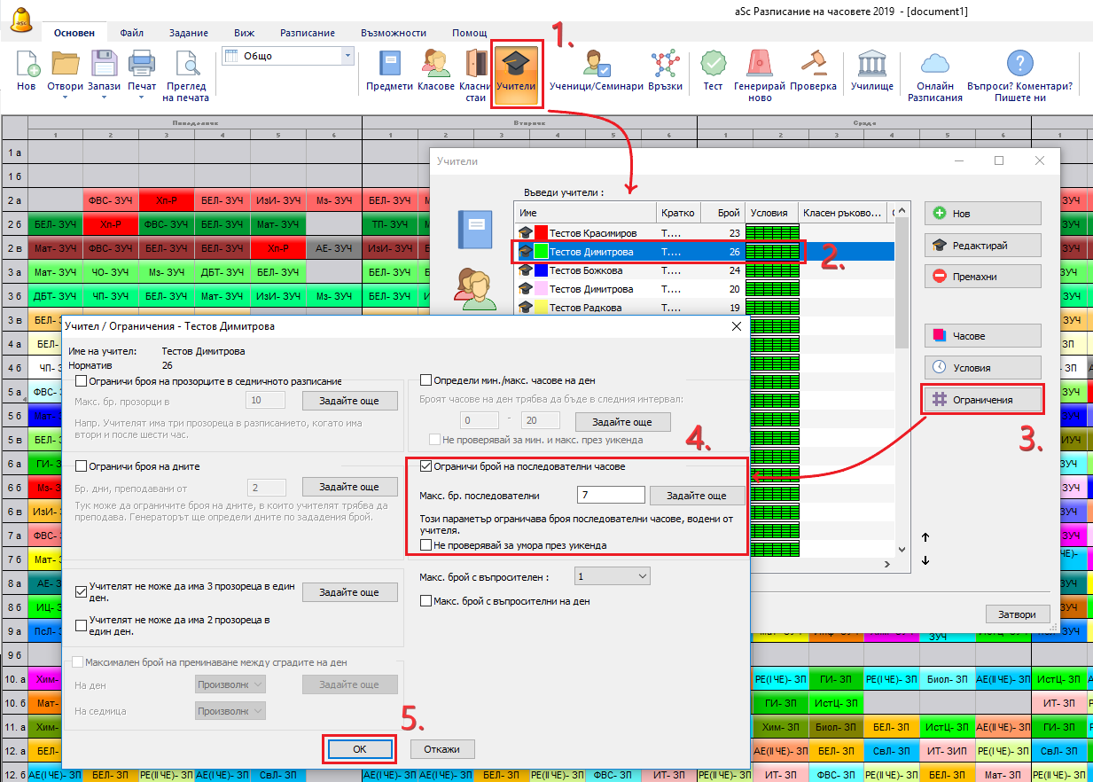 Също така можете да обозначите максимания борй часове, които един учител може да преподава последователно за всеки учител поотделно:
