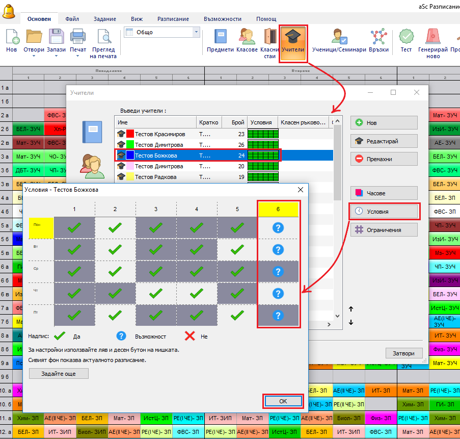 Можете да обозначите колко часа могат да се поставят в позиция под въпрос. Mожете, например да обозначите, че при даден учител шестият час е под въпрос, а максимумът е 2часа. Тогава учителят ще има само два шести часа на седмица.
