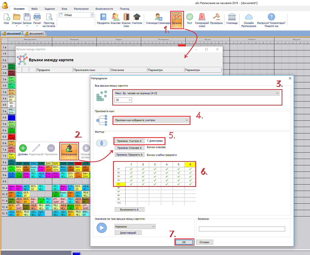 За да предотвартите това, трябва да определите разширени връзки в картата, които определят максимум часове, които един учител може да преподава през първите 5 дни (първата седмица):