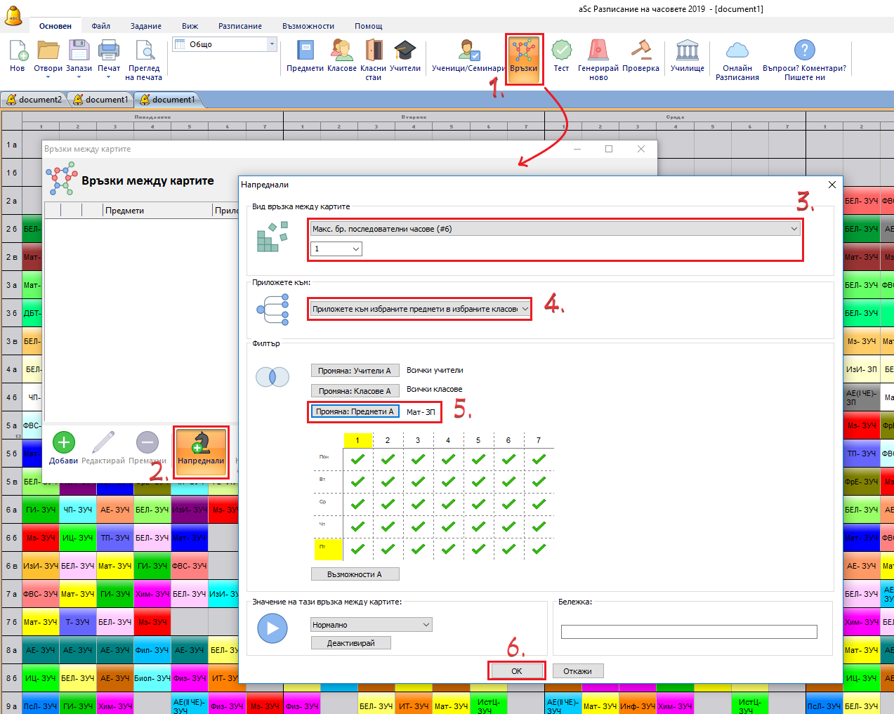 Ако имате 6 часа по математика в 5 дни от седмицата, тогава ще има два часа математика в един ден. Ако те не могат да са един след друг, е нужно да добавите разширена връзка в картата: