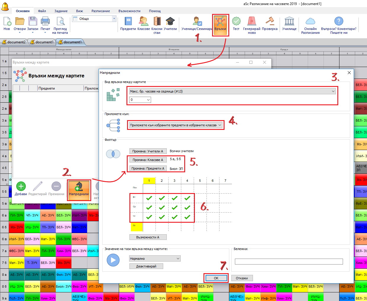 Връзката в картата казва, че може да има максимум 0, което означава – няма часове по Биология за маркираното време в определените класове (5a/ 5б). С други думи биологията в тази класове може да бъде единствено в немаркирана позиция.
