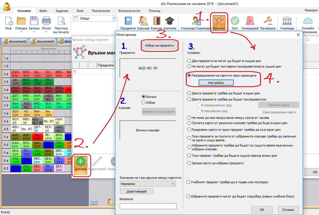 Можете също да създадете променено разпределение, където можете да обозначите точно в колко дни предметът ще се преподава. Използването на този начин позволява да обозначите, че два единични часа в един ден трябва да се поставят последователно. Влезте в менюто - Основен/ Връзки/ Добави, след това изберете предмет/и и клас/класове. После изберете "Разпределяне на картите през седмицата" и цъкнете на Настройки: