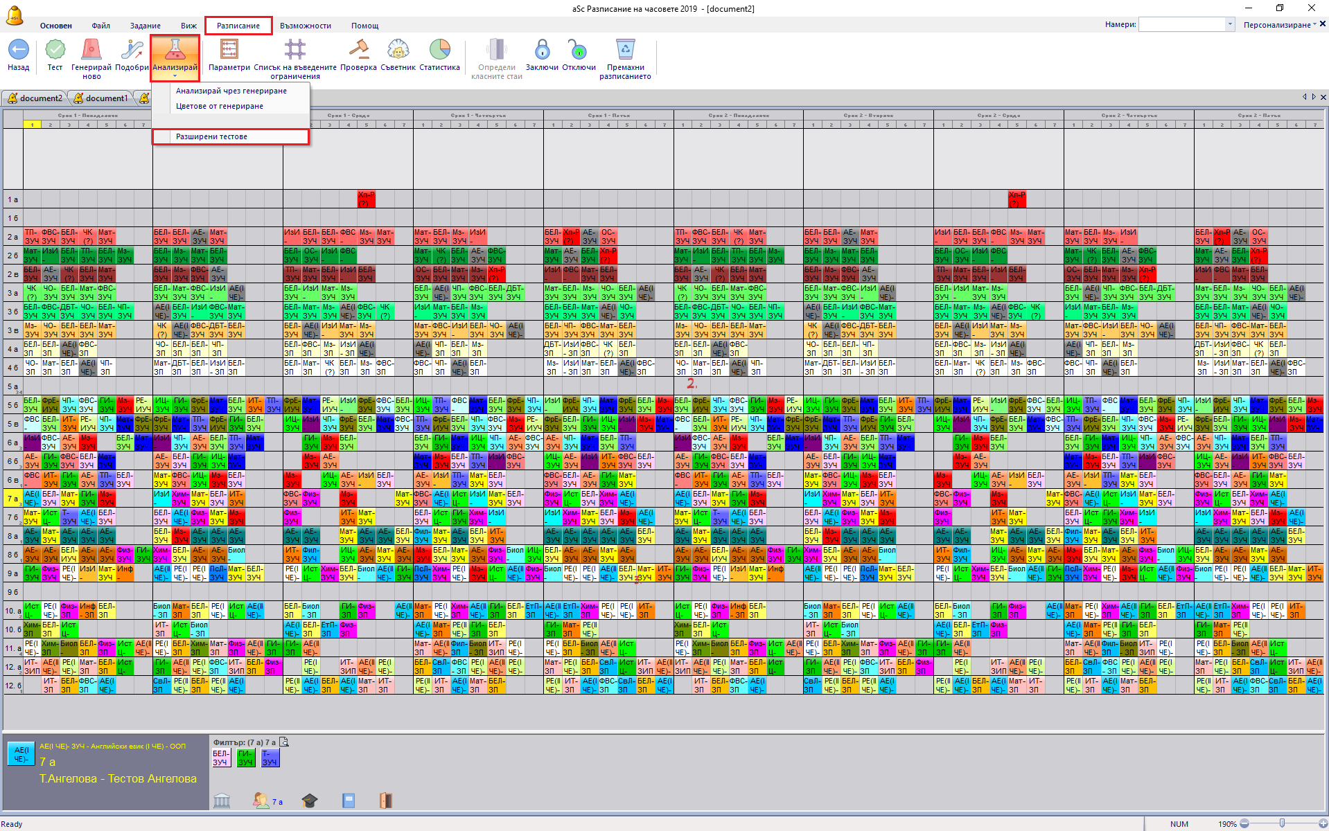 Може да стартирате чрез меню – Разписание/ Анализирай/ Разширени тестове: