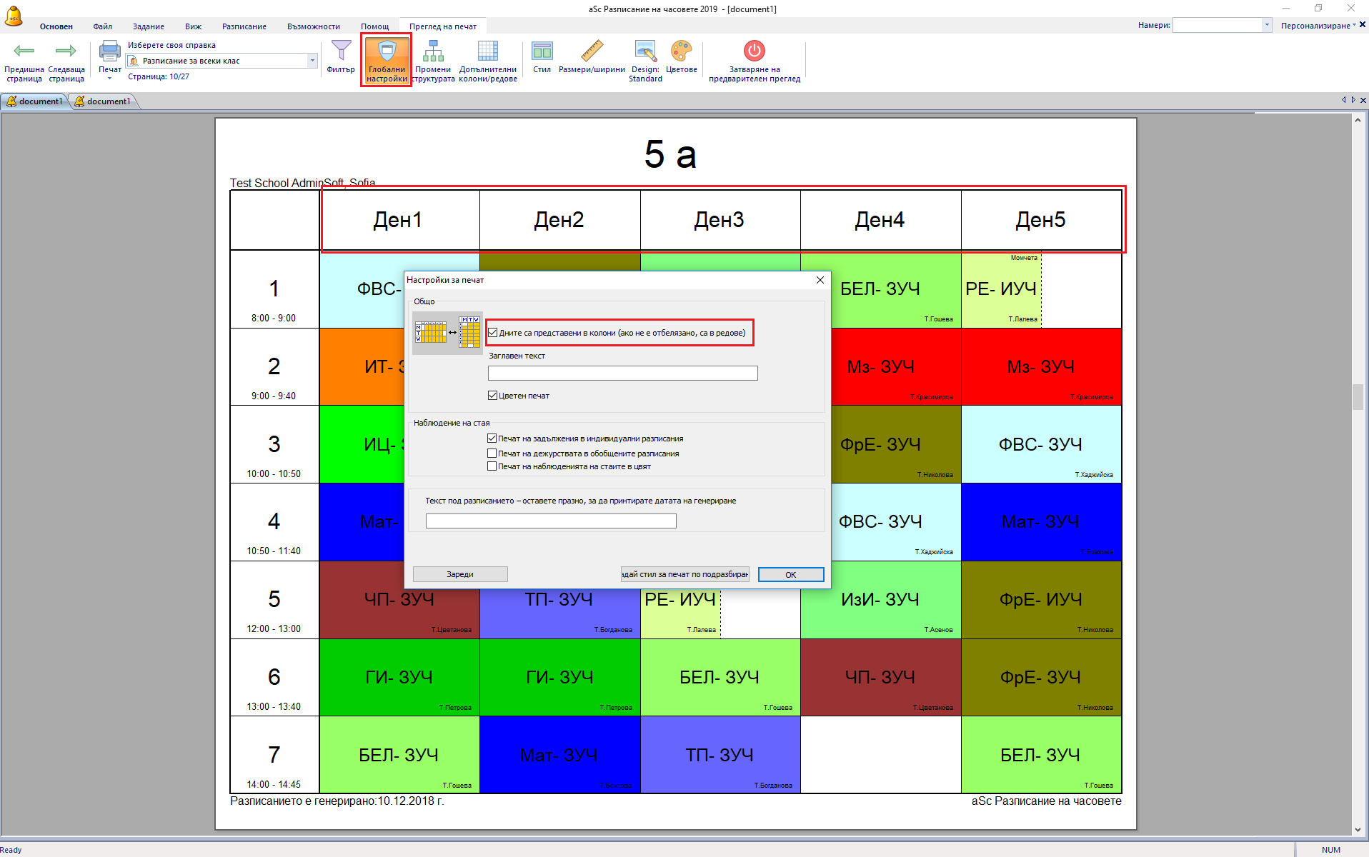 По подразбиране софтуерът принтира индивидуалния график на учители, класове или класни стаи като използва дните като редове и учебното време като колони.