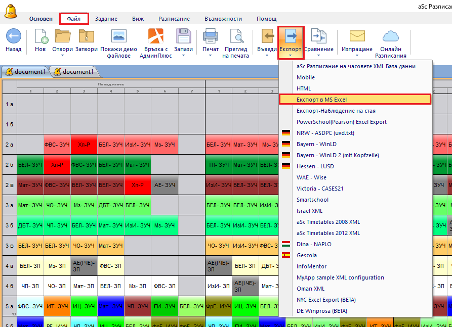 Изберете меню Файл/ Експорт/ Експорт в MS Excel: