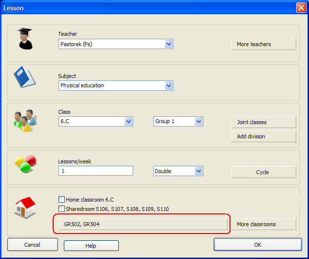 Importante: el software usará UNA de las aulas especificadas. Así que si dice que esta lección puede ser en un aula compartida o en GR502 o en GR504, el software podrá usar una de las aulas compartidas o GR502 o GR504. Recuerde que las aulas al igual que los profesores y las clases pueden tener asignado como máximo cantidad de lecciones las que se definan en los datos de la Escuela: multiplicando días por lecciones por día. ejem 5 dias x 7 lecciones por dia = 35.