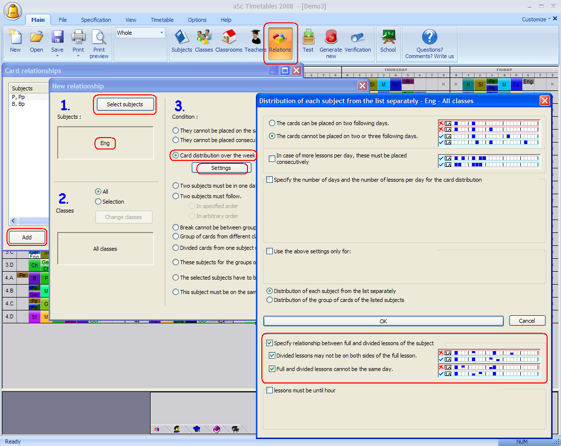 En algunas escuelas ciertas asignaturas se imparten de modo que en la mayoría de las asignaturas los estudiantes tienen la lección como clase entera, pero para algunas lecciones se dividen p. ej. en dos grupos. En este caso es muy importante introducir algunas restricciones para que no haya caos en el horario: