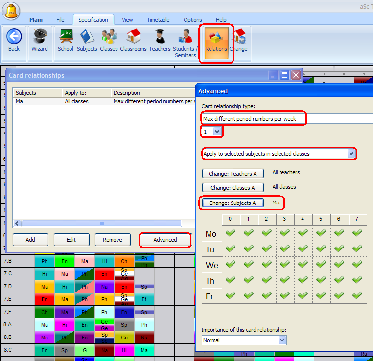 Uso avanzado: en algunos casos Usted puede necesitar utilizar el modo avanzado de relaciones entre fichas. Por ejemplo si la clase tienen dos lecciones de inglés con el maestro A y 3 lecciones de conversación con el maestro B y Usted desea que ambas asignaturas estén en el mismo horario cada día. El uso de la forma avanzada de relaciones entre fichas sería de la siguiente manera: