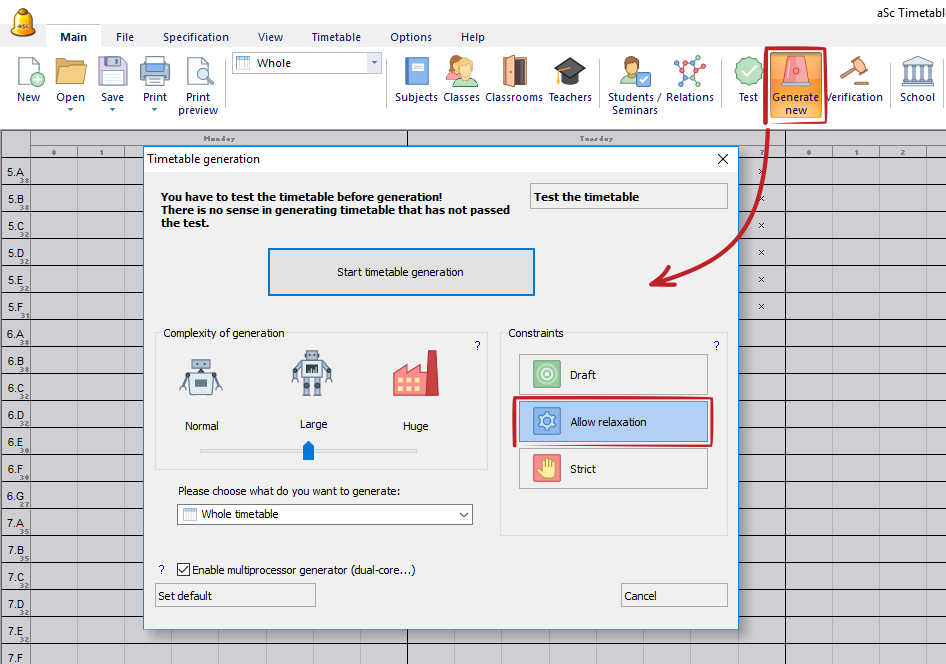 1. Puede ayudarle con la identificación de lo que puede ser el problema con su horario y cuáles de las condiciones parece que son demasiado restrictivas. . Si genera su horario con el relajamineto activado, será más probable que el horario se logre generar. Después puede ver qué condiciones han sido relajadas y pensar si son razonables. O puede decidir cambiar la configuración de ciertas condiciones hacia valores más fáciles.